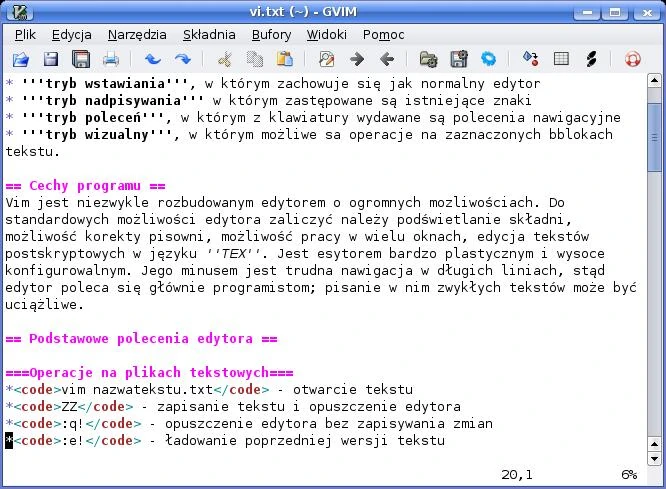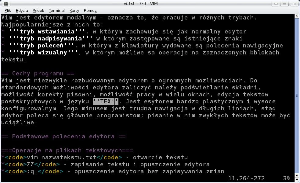 vim nazwatekstu.txt– otwarcie tekstu,ZZ– zapisanie tekstu i opuszczenie edytora,:q!– opuszczenie edytora bez zapisywania zmian,:e!– ładowanie poprzedniej wersji tekstu.